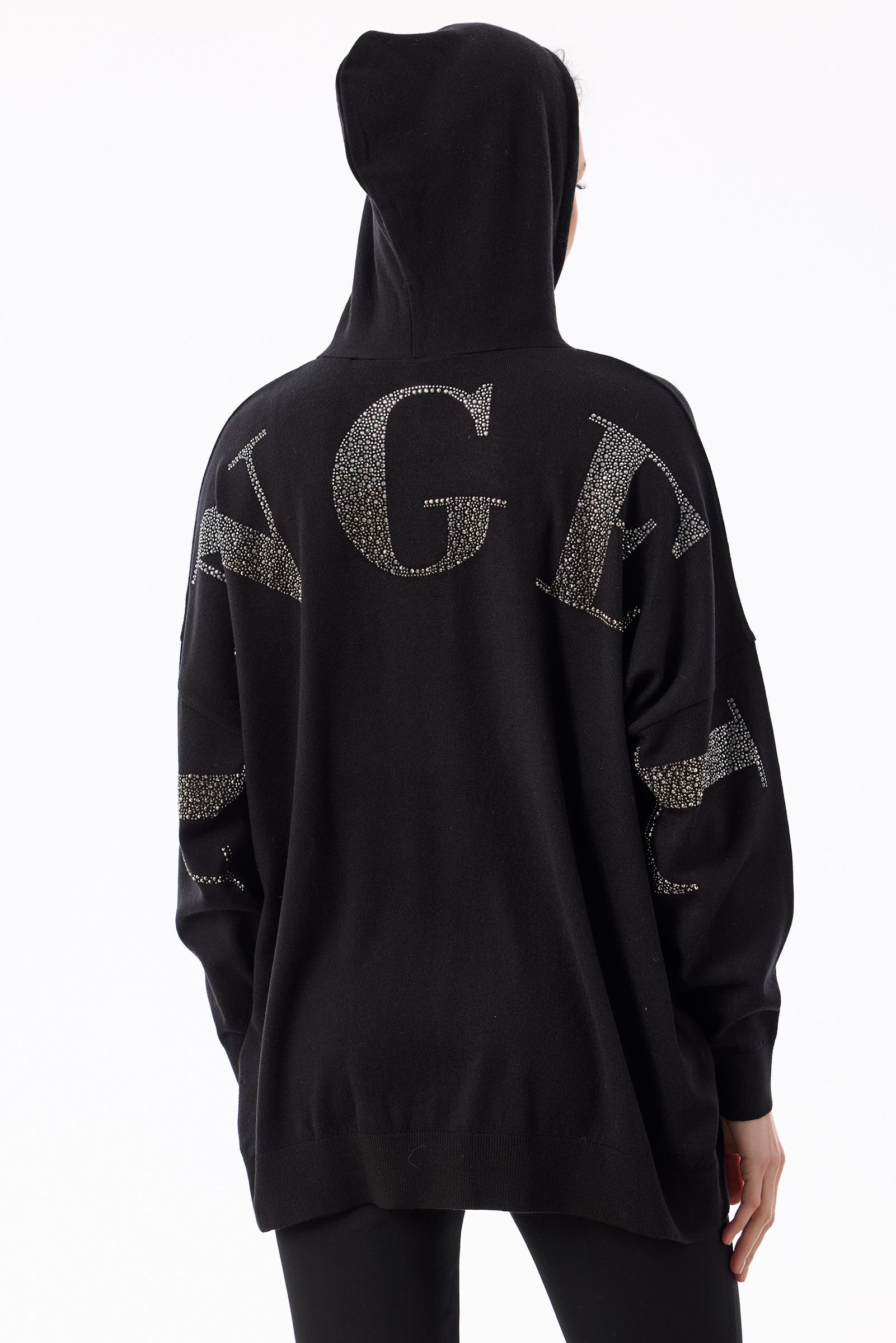 Arkası Taş Yazı Baskılı Kapüşonlu Tunik SİYAH