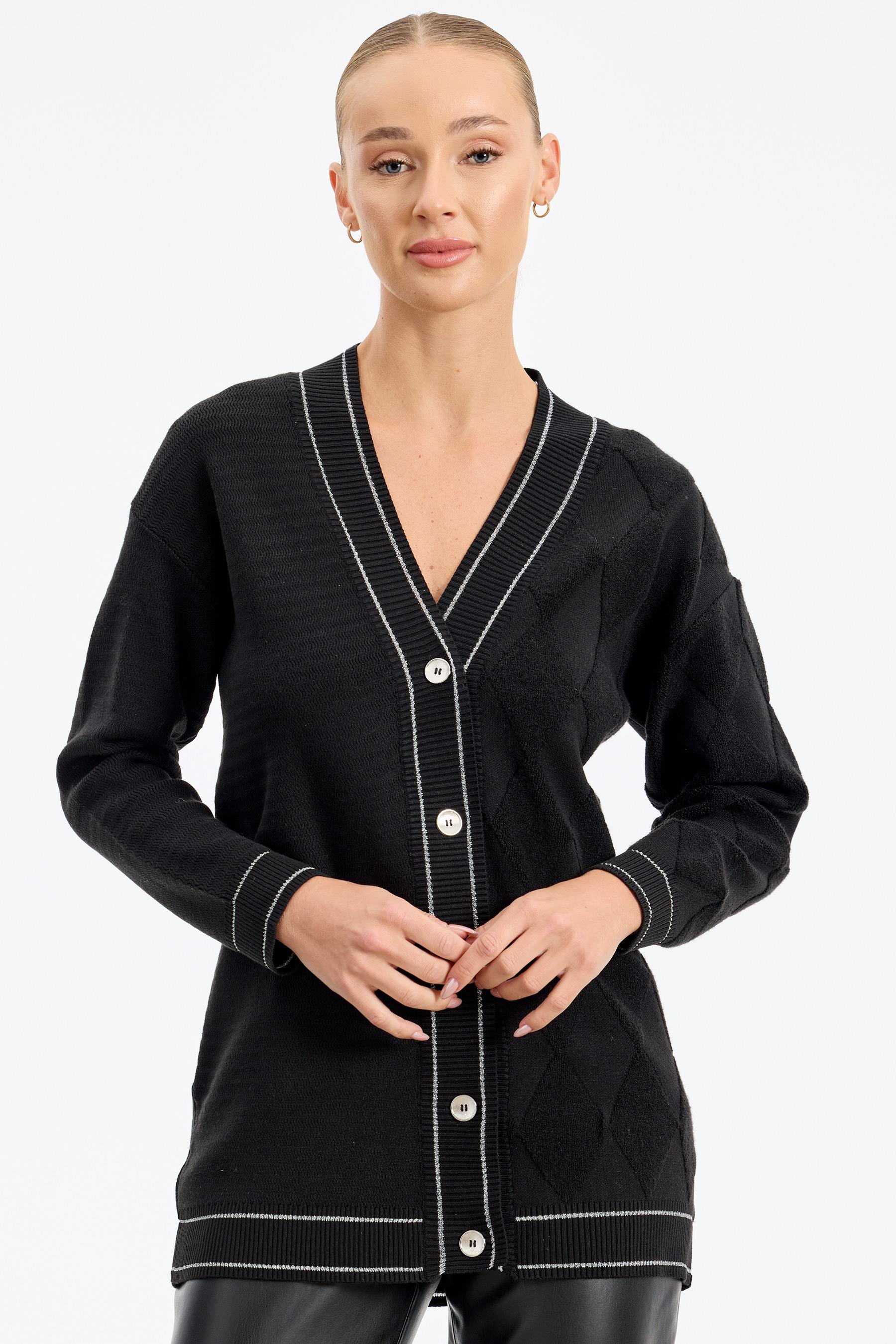 Baklava Deseni Havlu Örgülü Triko Hırka SİYAH