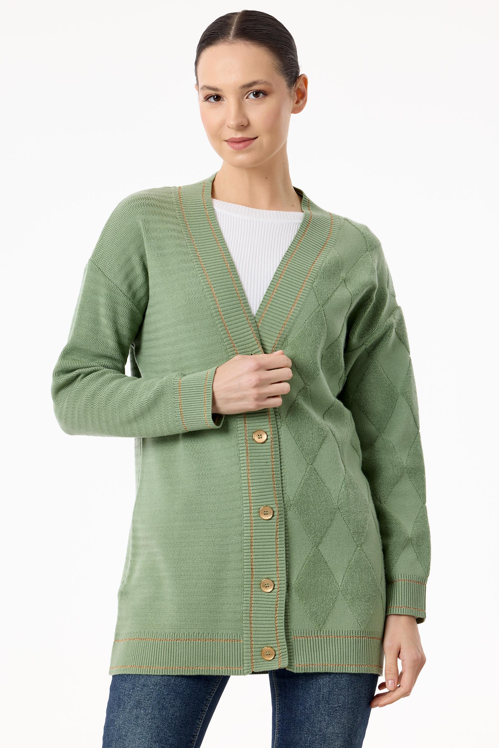 Baklava Deseni Havlu Örgülü Triko Hırka YEŞİL