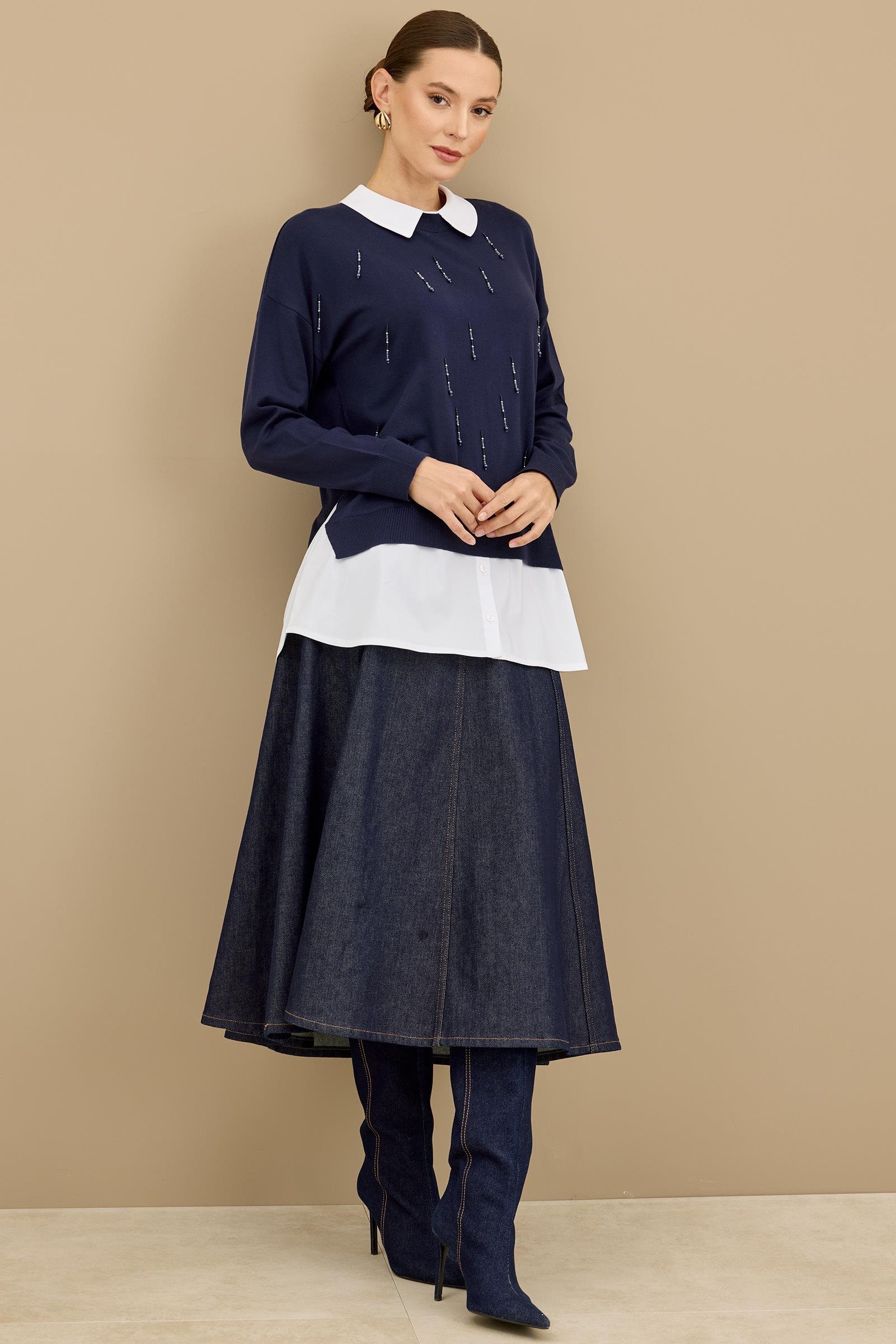 Boncuk İşlemeli Gömlek Detaylı Tunik LACİVERT