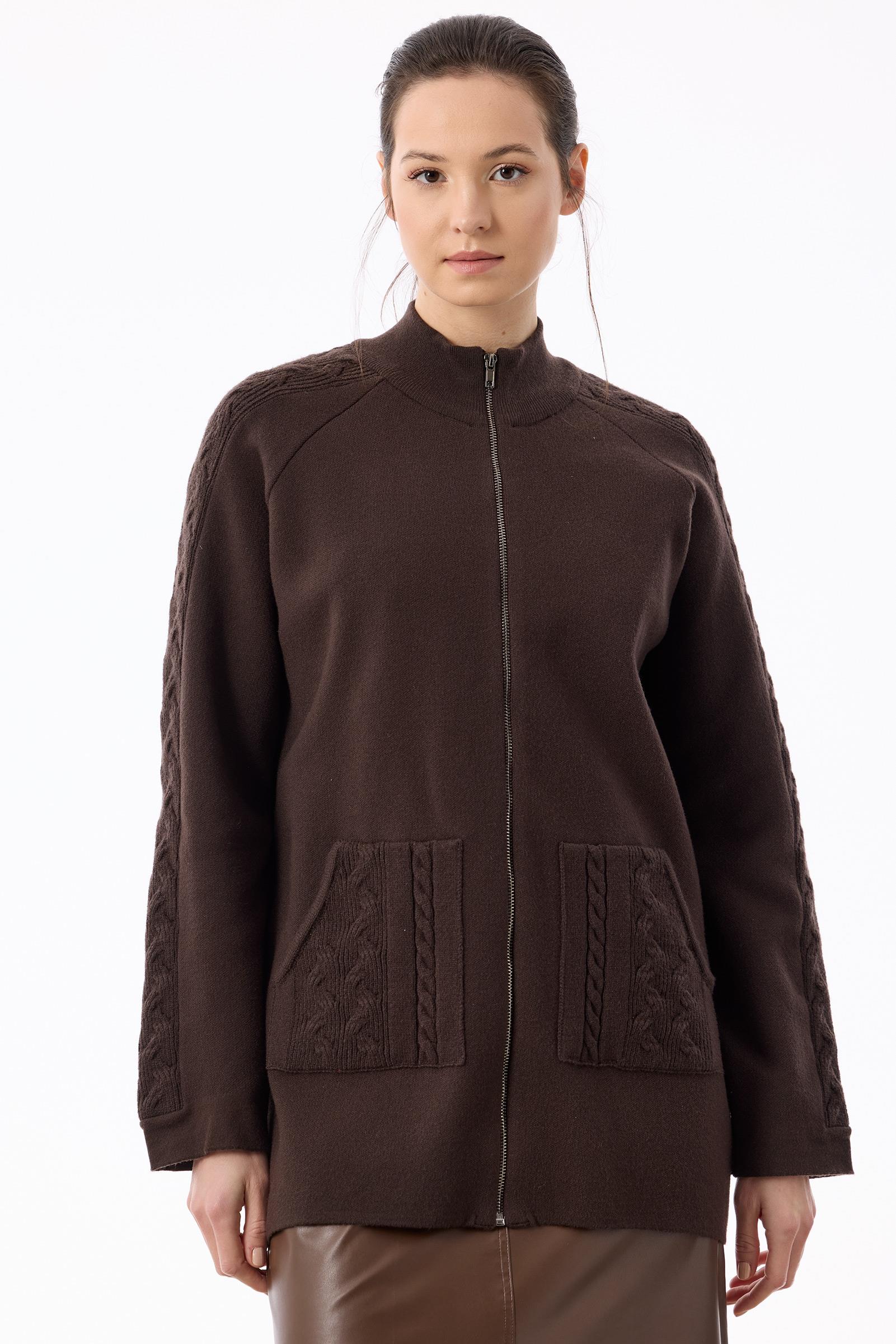 Cepleri Saç Örgülü Fermuarlı Hırka KAHVE
