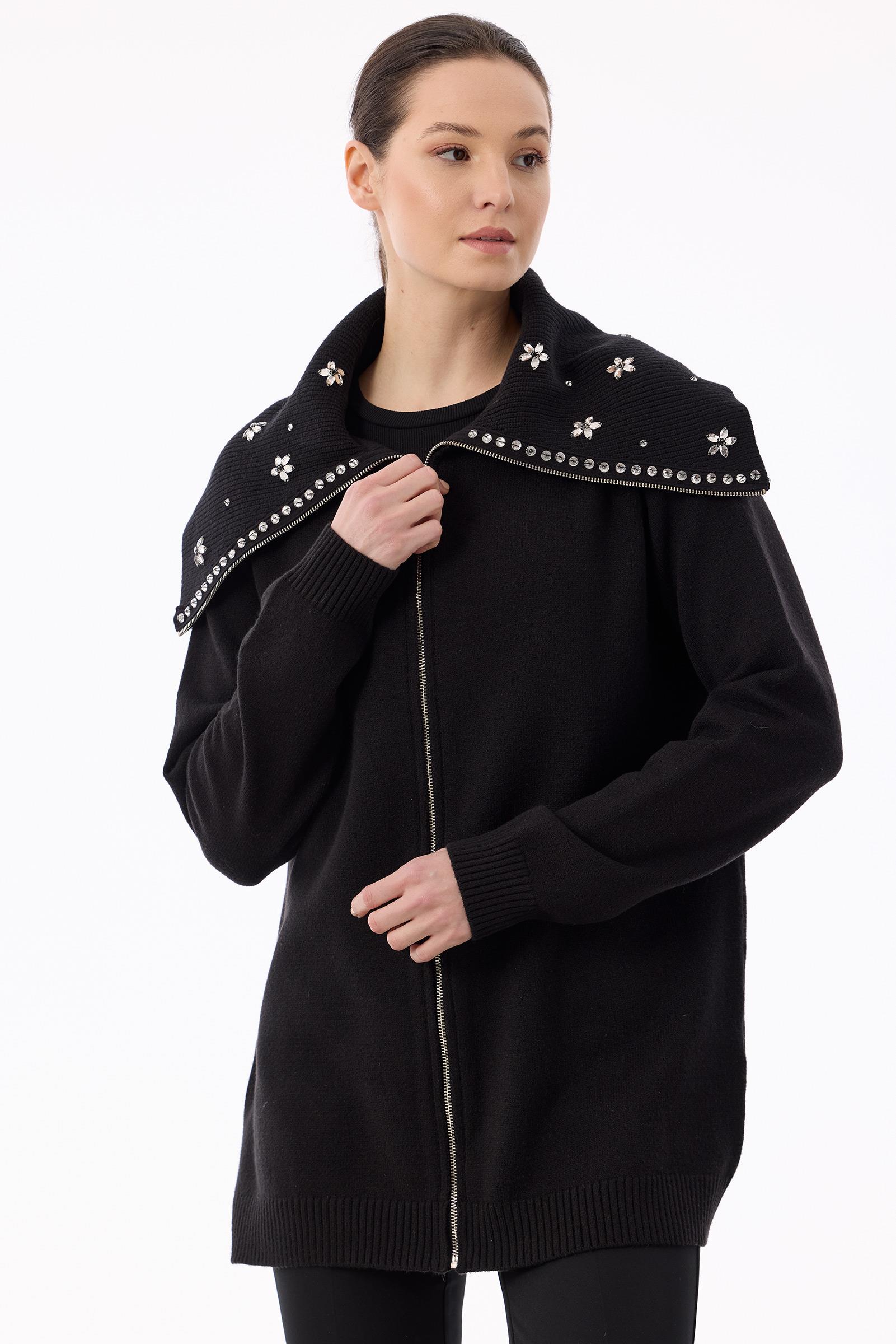 Denizci Yaka Önden Fermuarlı Dikme Taşlı Hırka SİYAH