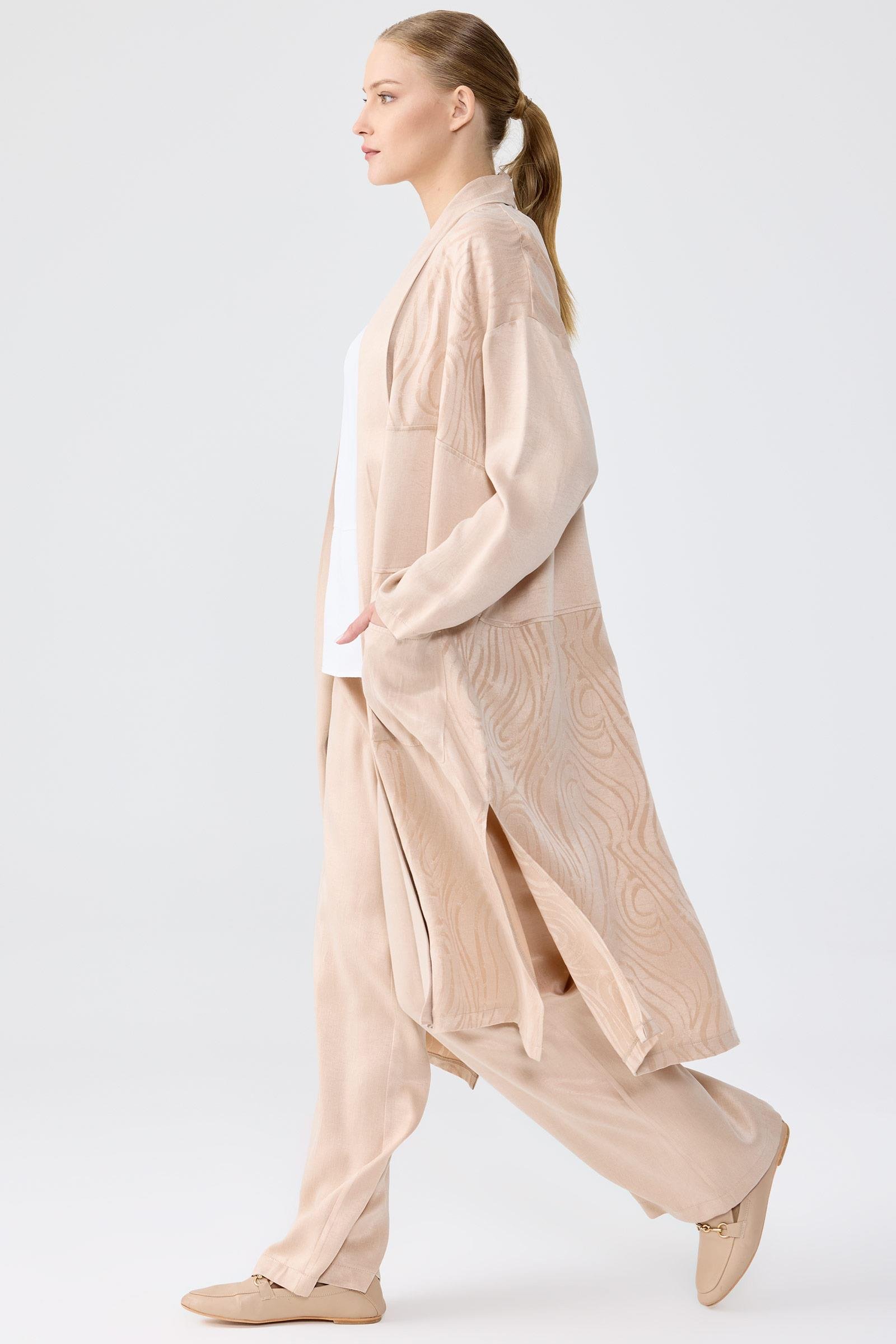 Desenli Ve Düz Kumaş Kombinli Uzun Hırka Takım BEJ