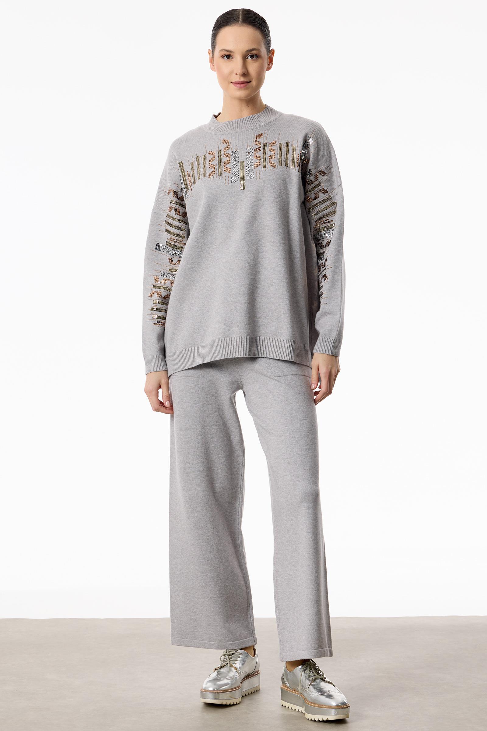 Etnik Desenli Taşlı Triko Pantolon Takım GRİ (TKM.21770.1)