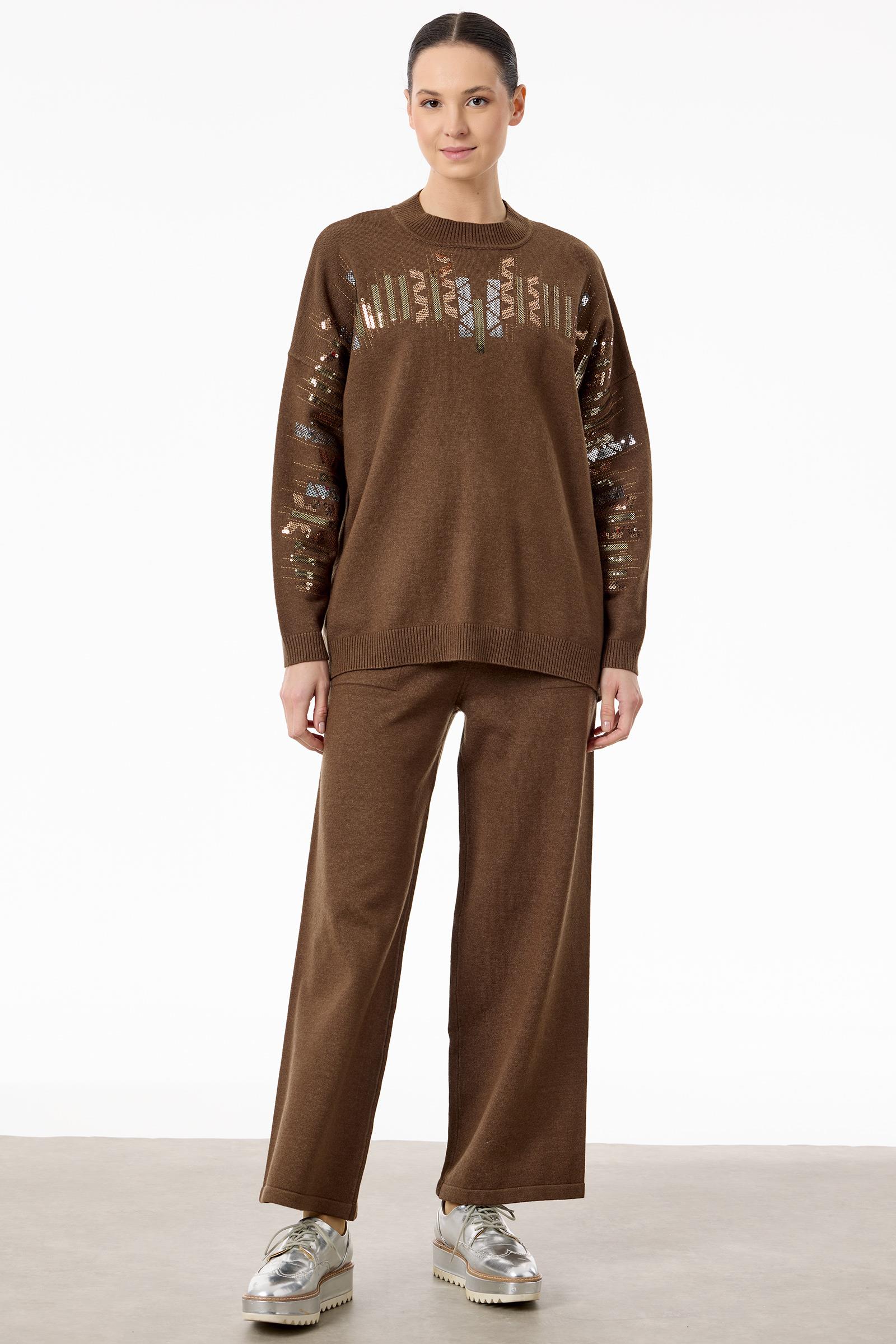 Etnik Desenli Taşlı Triko Pantolon Takım KAHVE (TKM.21770.1)