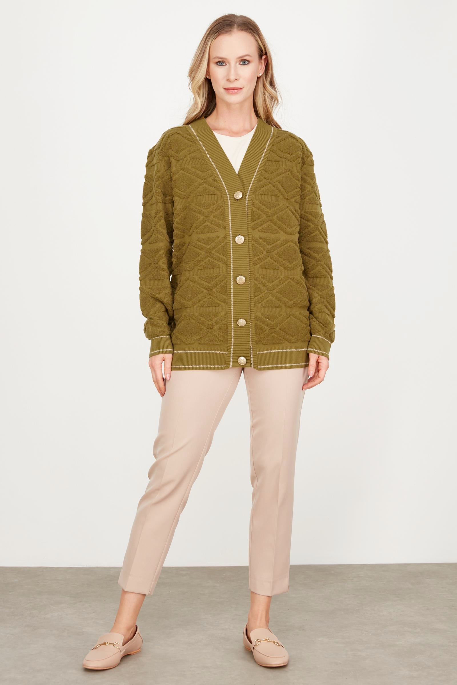 Havlu Örgü Detaylı Düğmeli Triko Hırka OLİVE