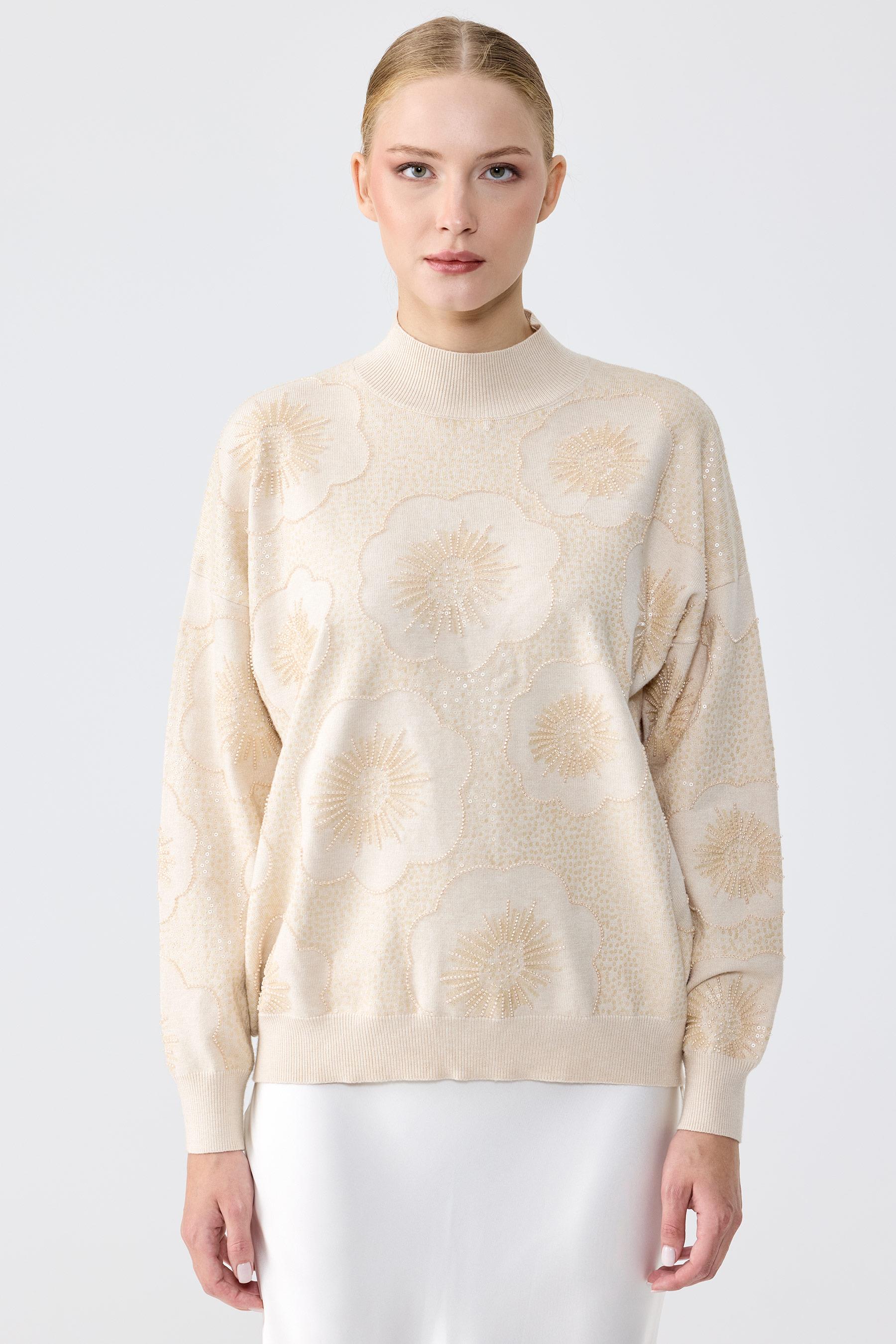 İşlemeli Yarım Balıkcı Yaka Bluz BEJ