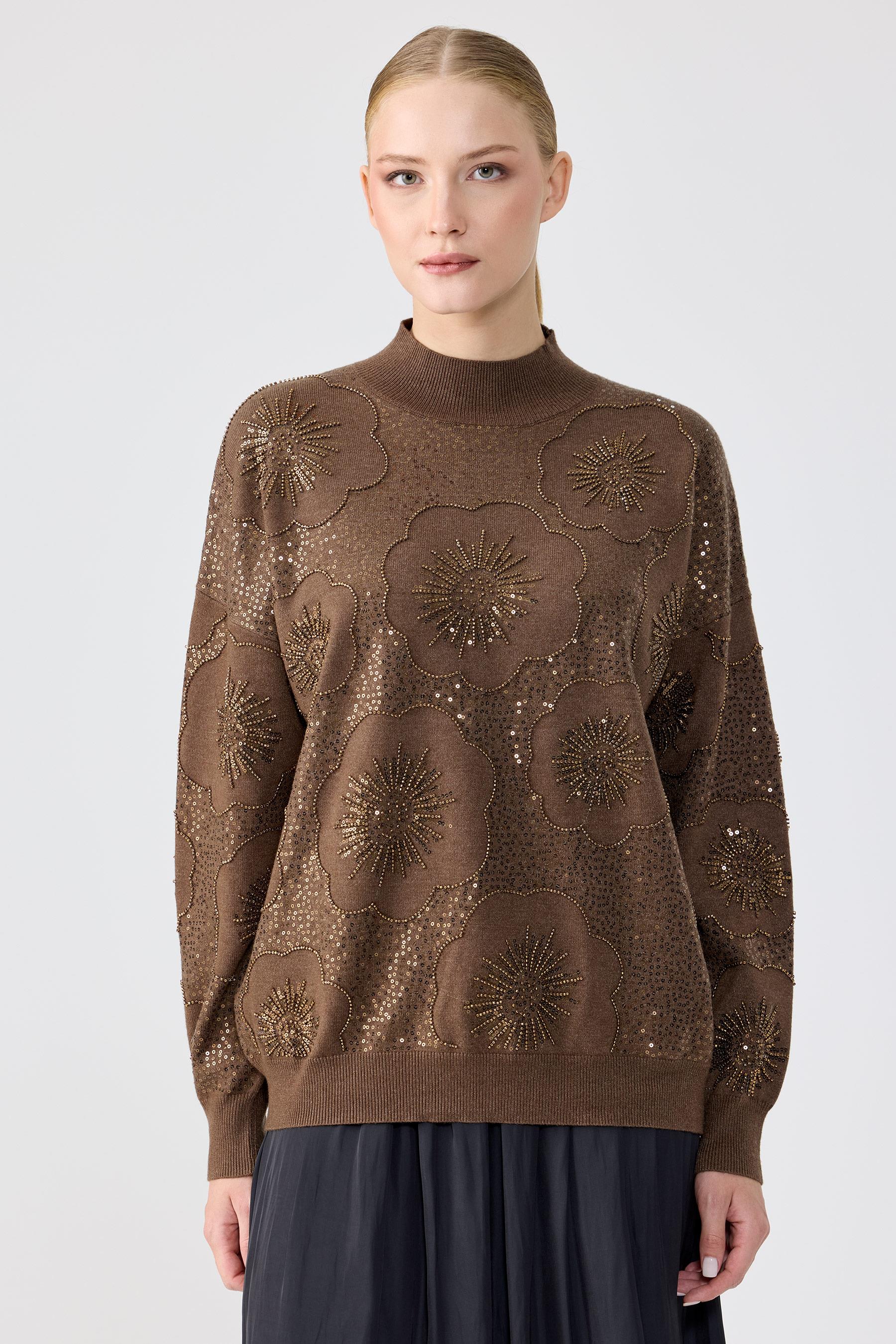 İşlemeli Yarım Balıkcı Yaka Bluz KAHVE