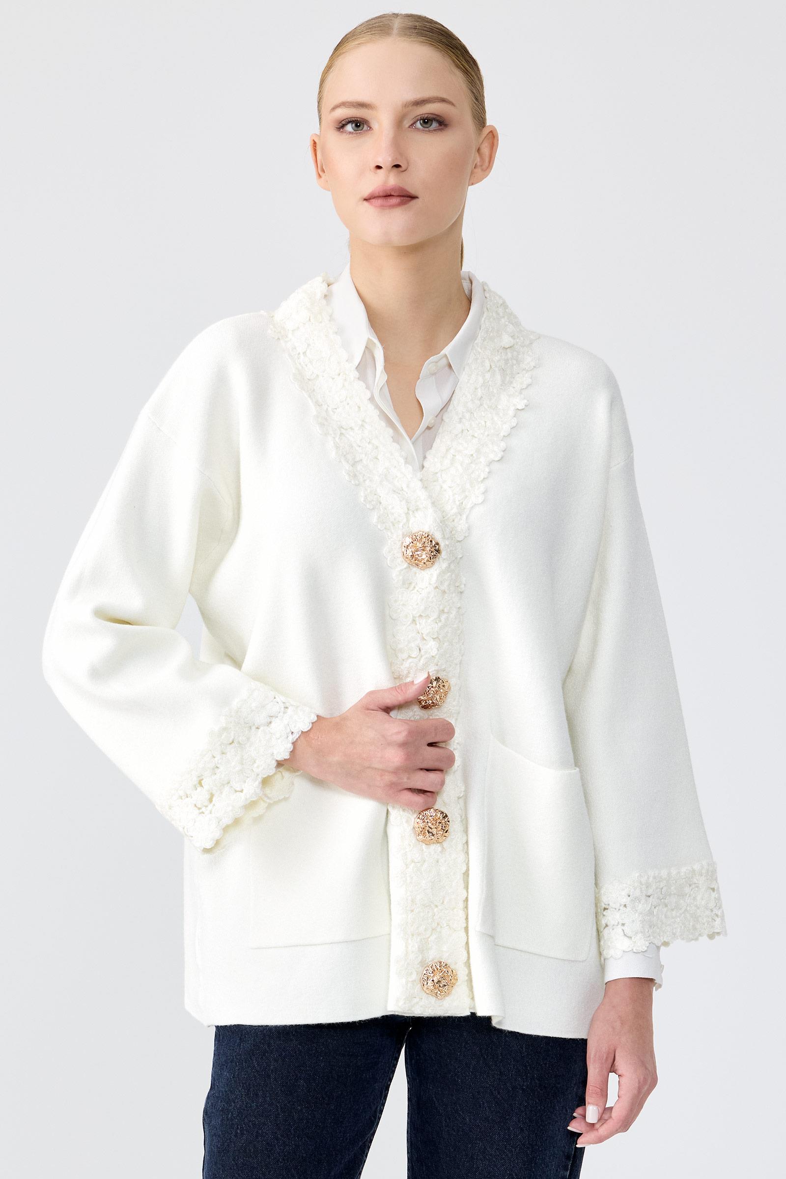 Kol Ve Pat Detaylı Düğmeli Triko Hırka EKRU