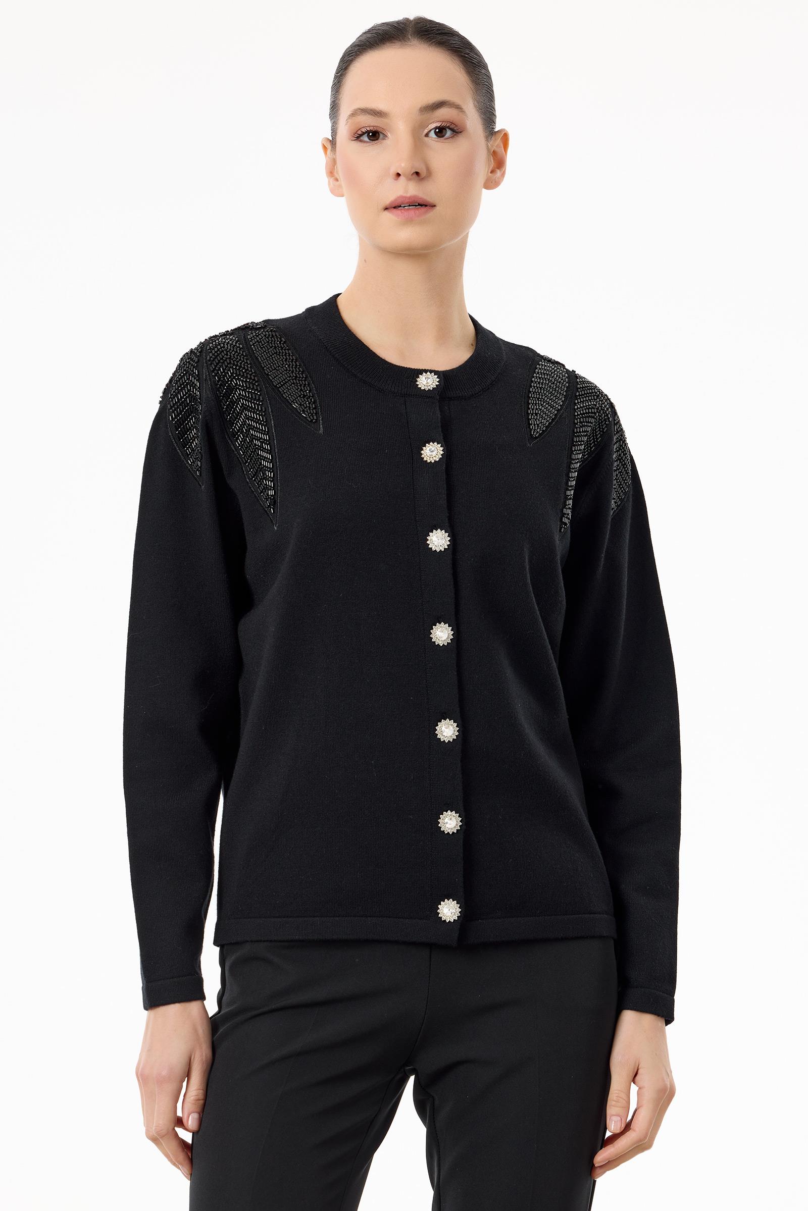 Omuzları Taşlı Kısa Triko Hırka SİYAH