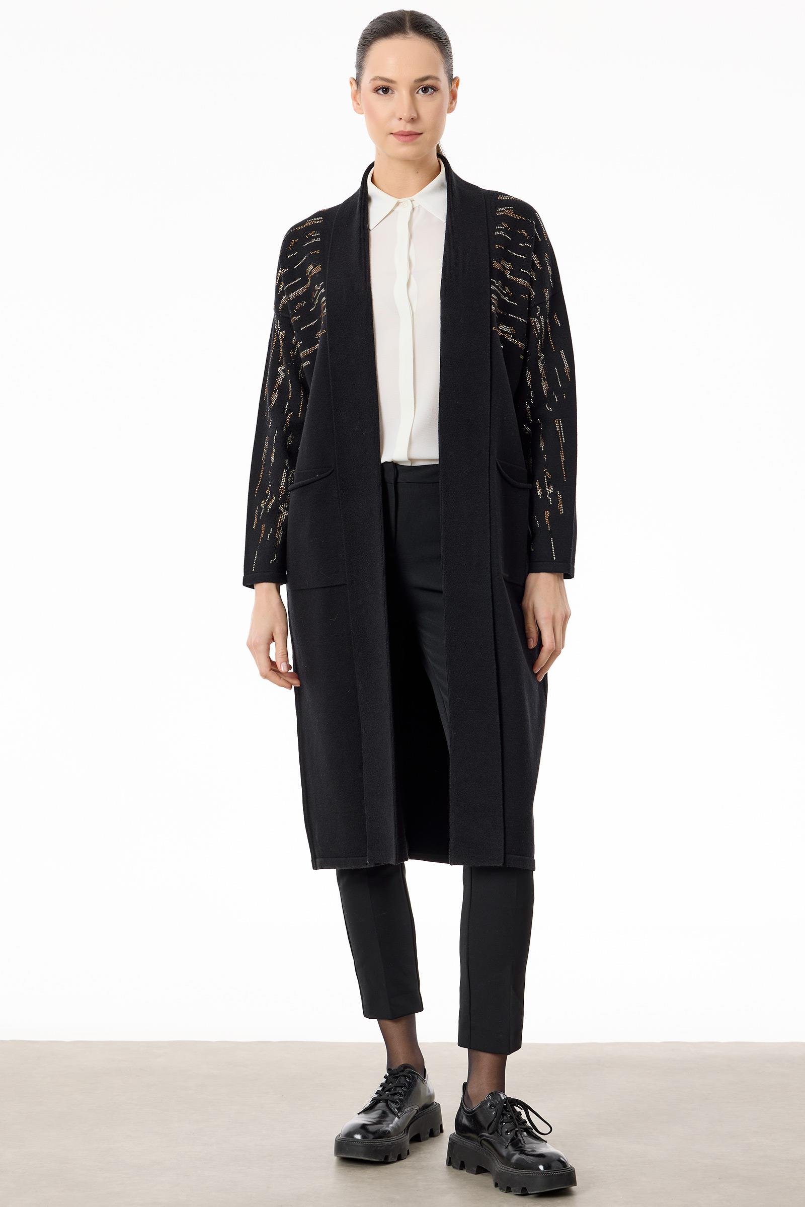 Omuzları Taşlı Şal Yakalı Triko Hırka SİYAH