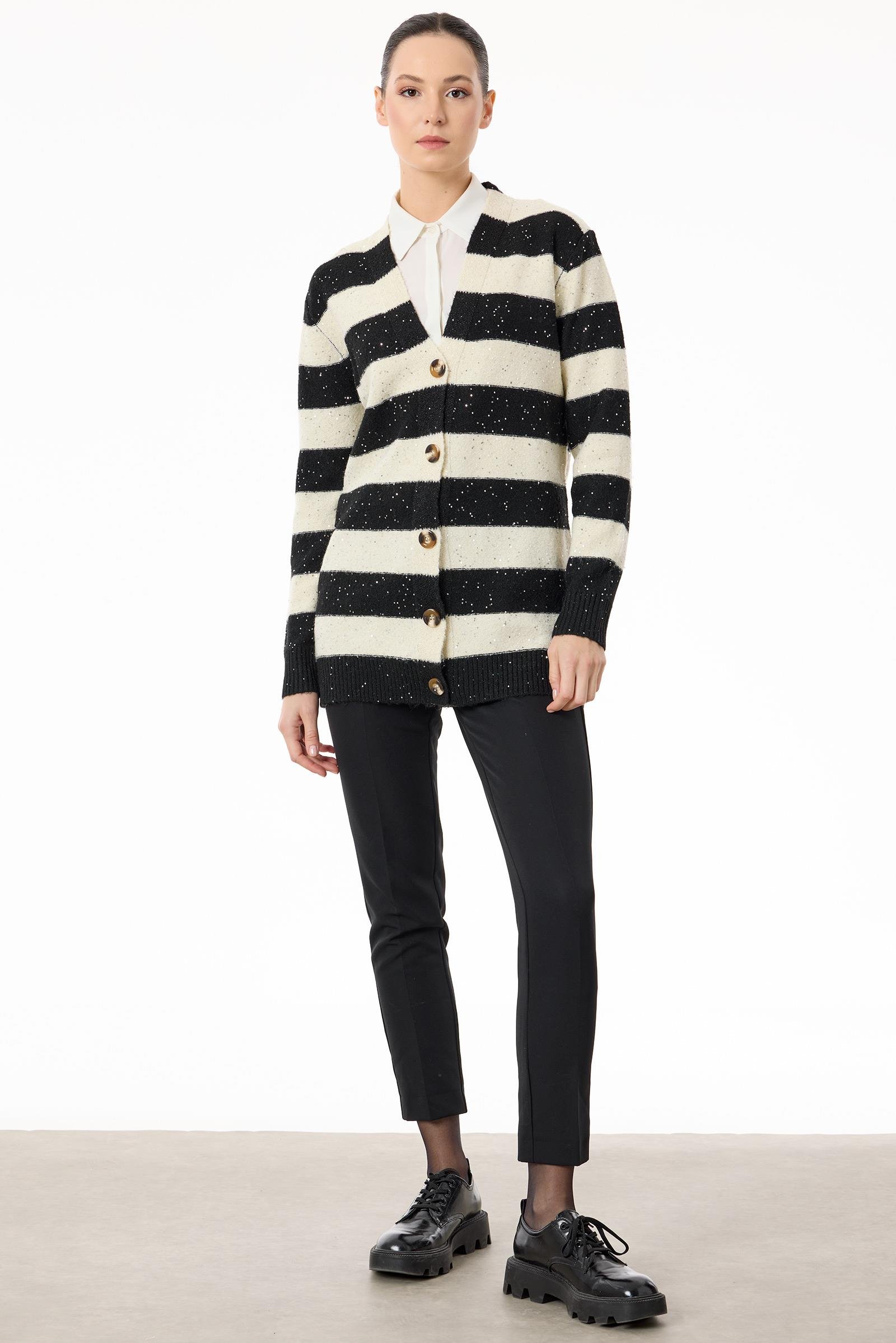 Payetli V Yaka Triko Hırka SİYAH-BEYAZ