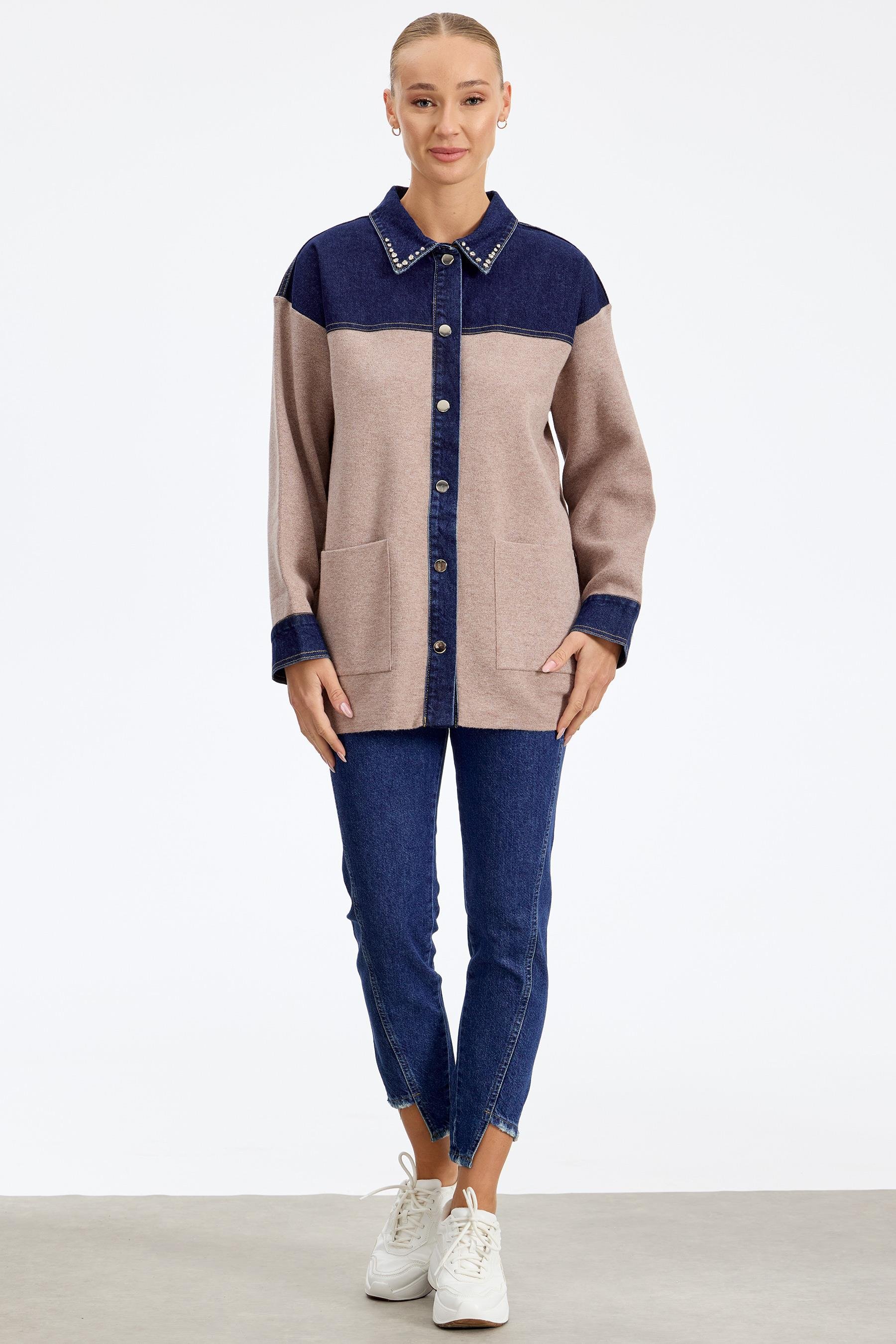 Robası Kot Detaylı Taşlı Ceket BEJ