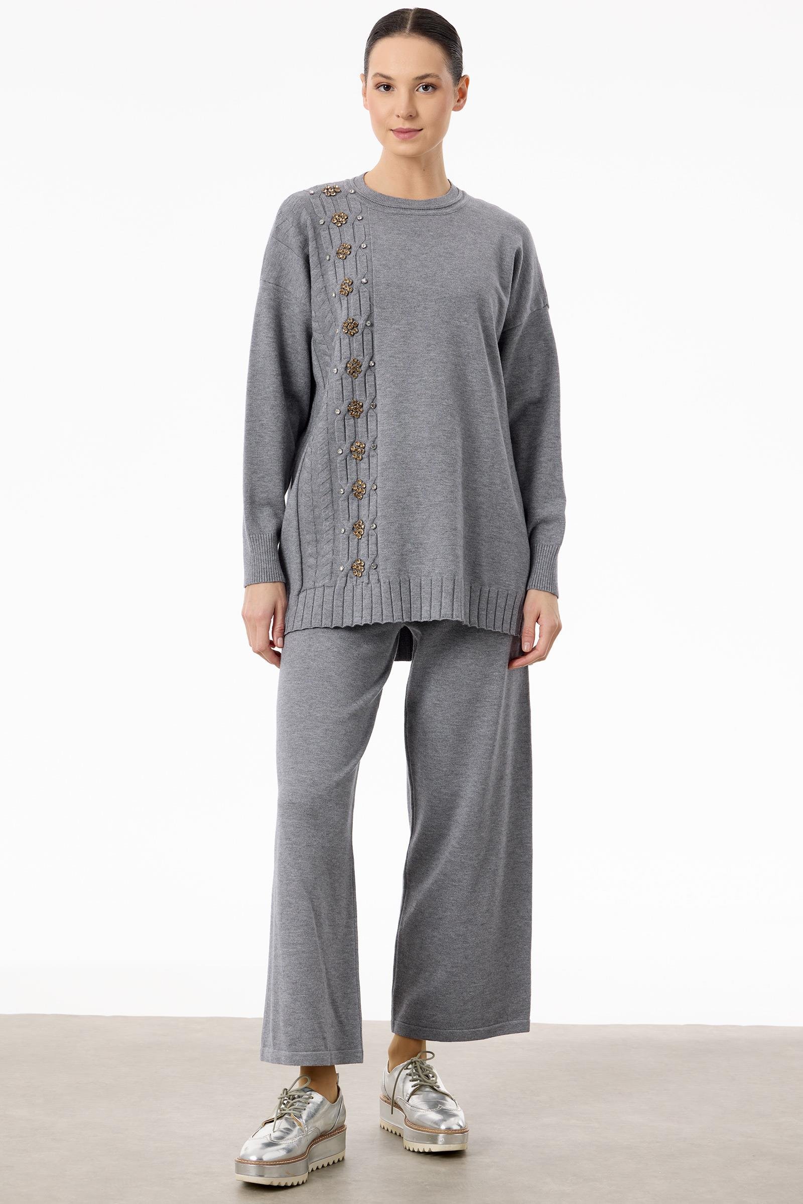 Saç Örgüsü Üzerine Taş Baskılı Pantolonlu Triko Takım GRİ (TKM.21752.1)