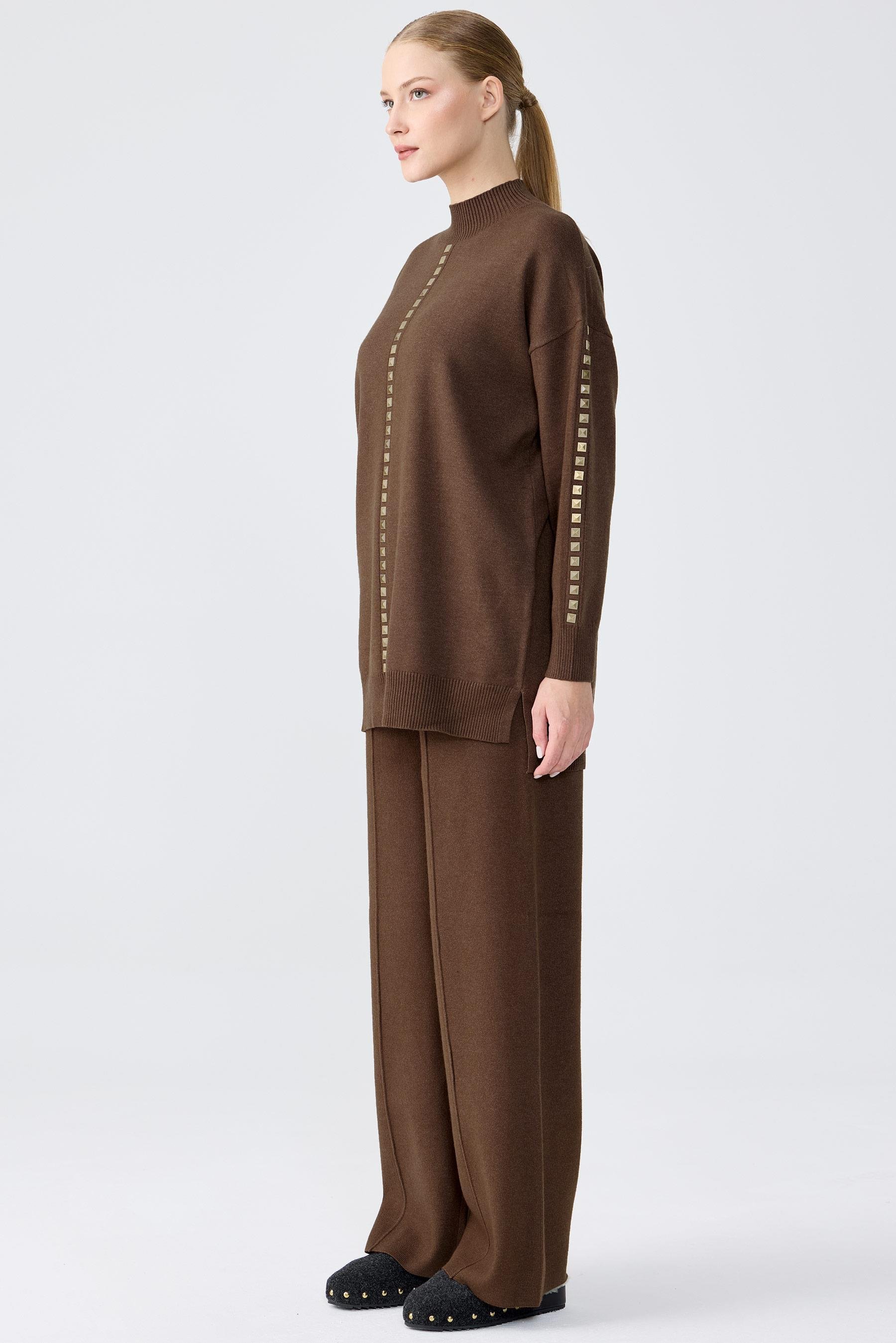 Şerit Taş İşlemeli Tunik Pantolon Takım KAHVE