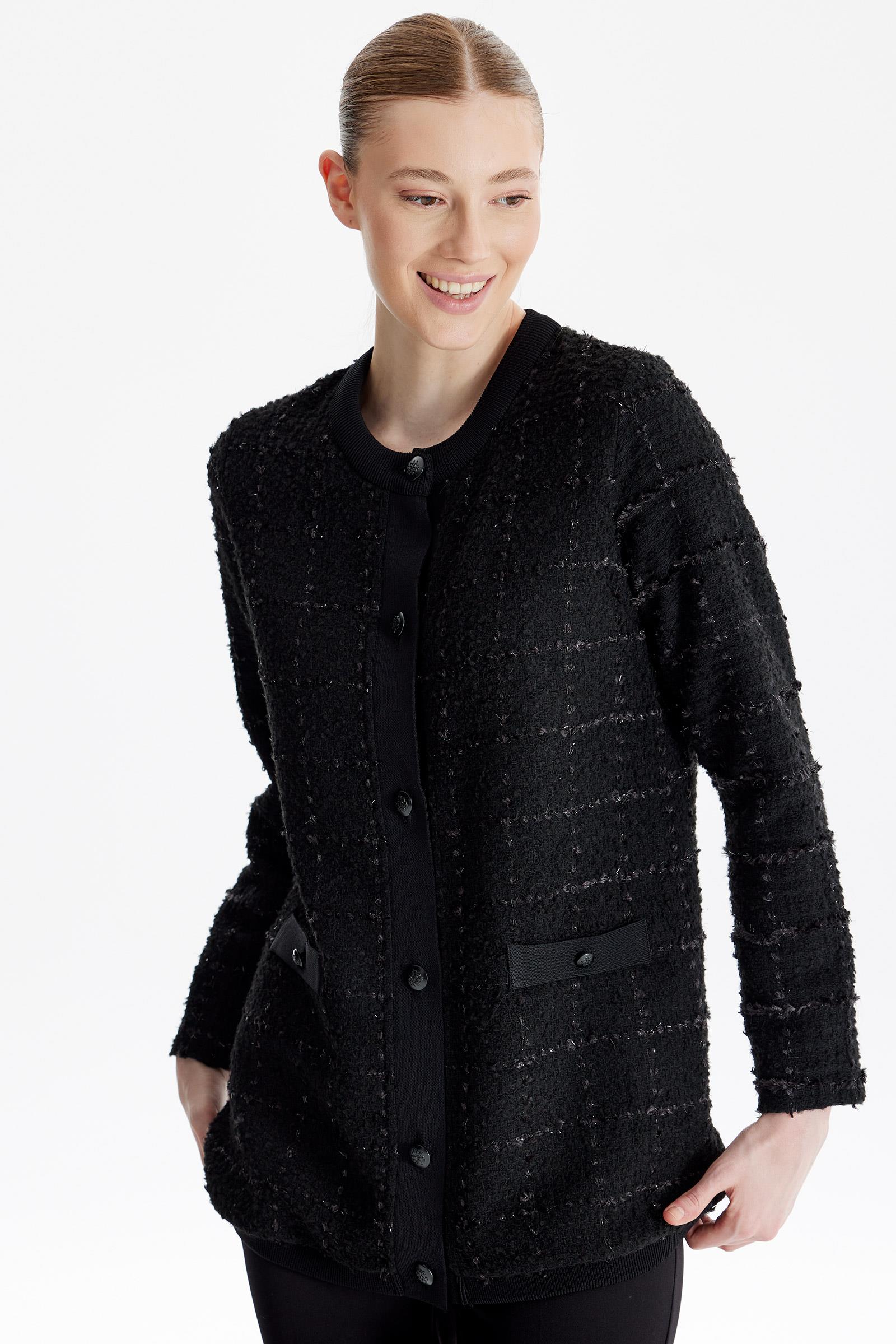 Sıfır Yaka Önden Düğmeli Tuvid Dokuma Hırka SİYAH