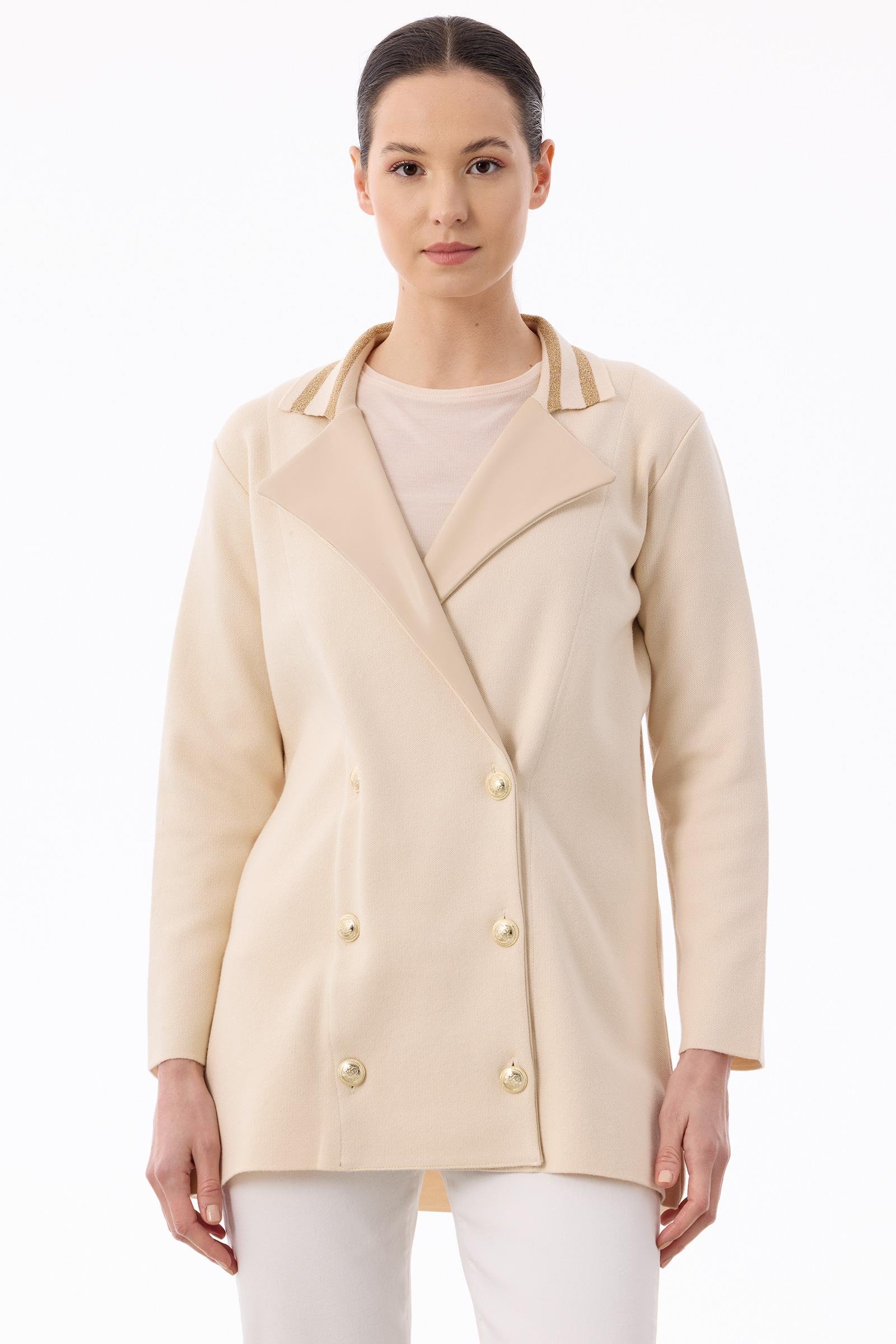 Yakası Deri Detaylı Çizgili Triko Ceket VANİLYA